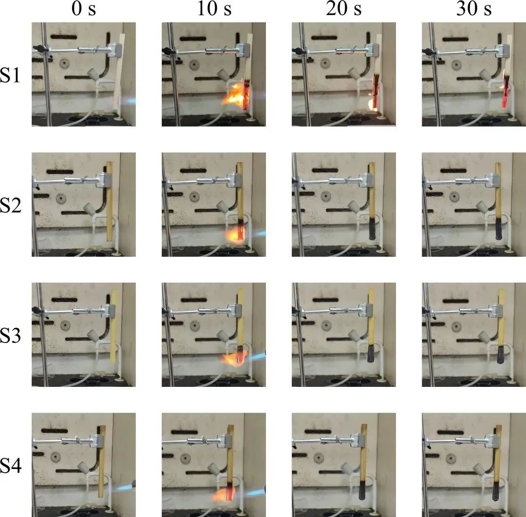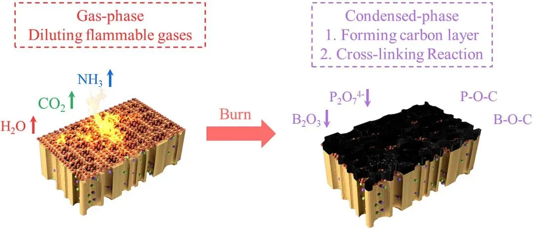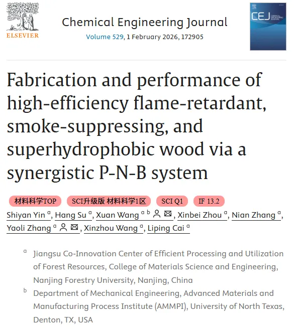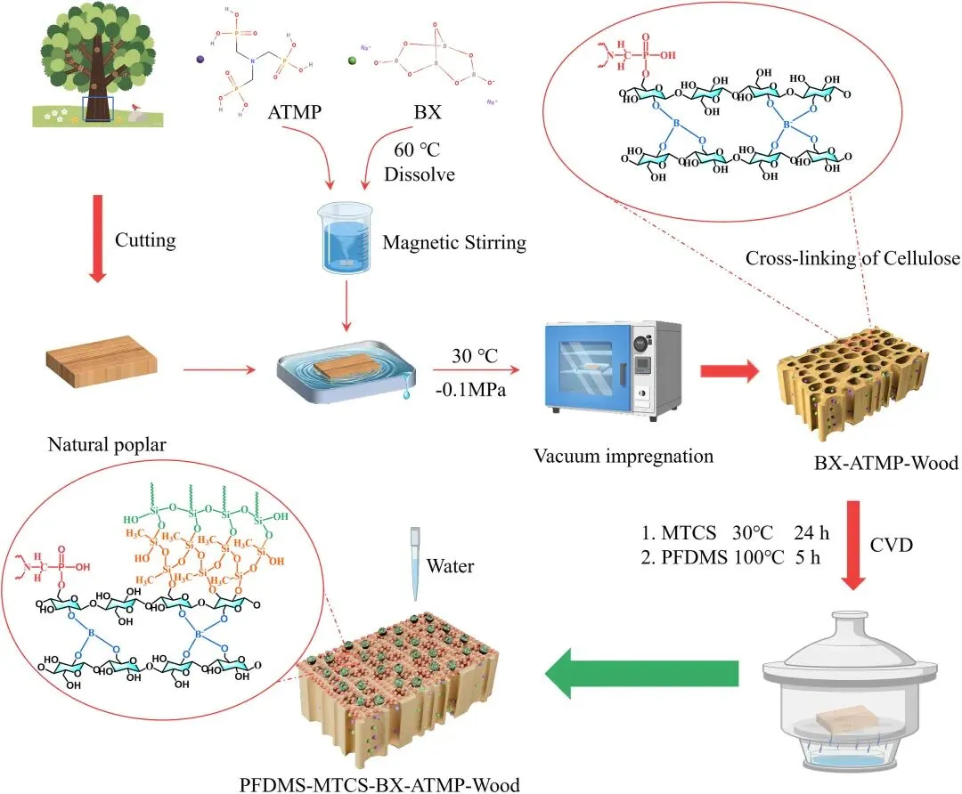 木材作为一种可再生、环境友好且力学性能优良的天然材料,在建筑结构、室内装饰及家具制造等领域具有广泛应用前景,其中杨木因生长周期短、密度低而强度适中、资源丰富而尤为常用。然而,杨木本身高度易燃且具有显著吸湿性,在火灾条件下易迅速燃烧并释放大量烟气与有毒气体,同时在潮湿环境中易发生膨胀变形与阻燃剂迁移流失,严重制约其在高安全性与高湿环境中的应用。近年来,磷-氮-硼(P-N-B)协同阻燃体系因兼具成炭促进、气相稀释与玻璃态保护层形成等多重阻燃机制,被认为是提升木材阻燃性能的高效策略。然而,该体系普遍存在耐湿性差、尺寸稳定性不足等问题。与此同时,构建超疏水表面层被提出作为改善木材防潮与稳定性的有效手段,但现有超疏水-阻燃协同改性方法往往工艺复杂、依赖易燃粘结剂或有机溶剂,甚至在高温下削弱阻燃体系的成炭能力与防火效率。因此,开发一种兼具高效阻燃、抑烟减毒、优异耐湿性及结构稳定性,且工艺简洁可持续的木材多功能改性策略,成为当前木质材料防火与工程化应用领域的重要研究课题。