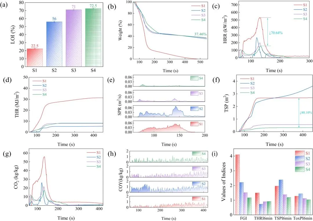 图3、 (a) LOI,(b) 混合物变化趋势。(c) HRR 曲线。(d) THR 曲线,(e) SPR 曲线。(f) TSP 曲线。(g, h) S1-S4 的 CO₂ 和 CO 产率。(i) S1-S4 的 FGI、THRI 6 min 、TSPI 6 min 和 ToxPI 6 min
