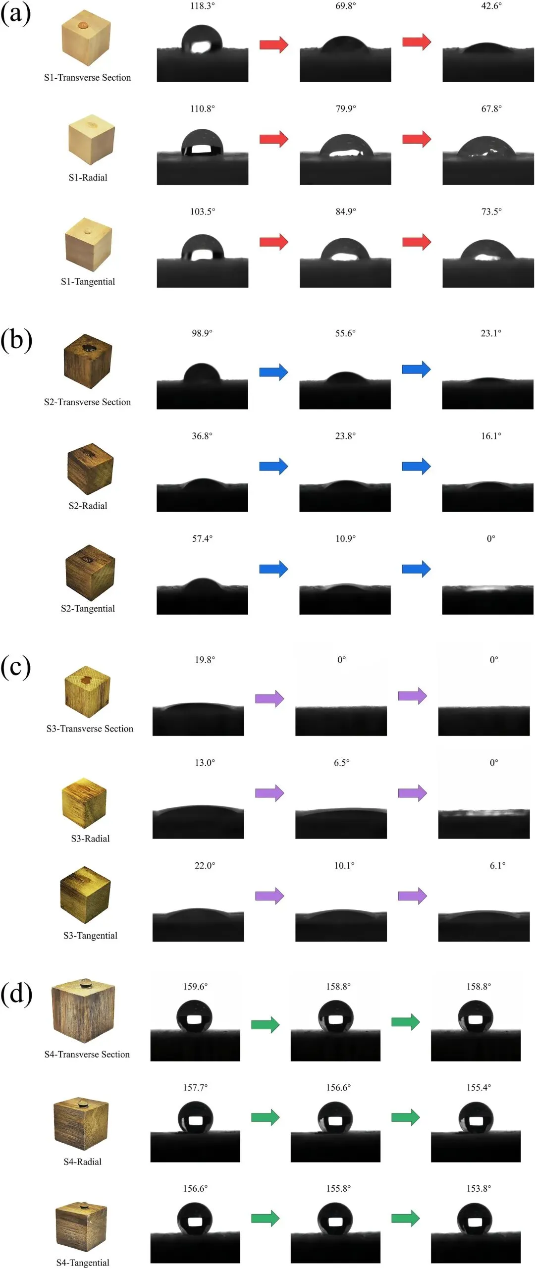 图4、 S1-S4 三个截面图上的水滴图像及其动态接触角