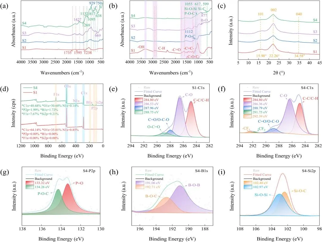 图5、 (a) S1-S4 的 FTIR 光谱。(b) S2-S4 经 CCT 处理后残炭的 FTIR 光谱。(c) S1 和 S4 的 XRD 图谱。(d) S1 和 S4 的 XPS 图谱。(e) S1-C1s 峰拟合分析。(f) S4-C1s、P2p、B1s、F1s 峰拟合分析