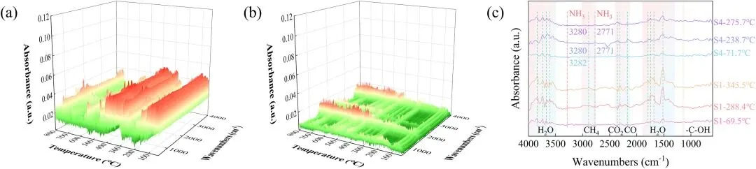 图6、 (ab)S1 和 S4 的 TG-IR 曲线。(c)S1 在 69.5 °C、288.4 °C 和 345.5 °C 时的 FTIR 光谱;以及 S4 在 71.7 °C、238.7 °C 和 275.7 °C 时的 FTIR 光谱