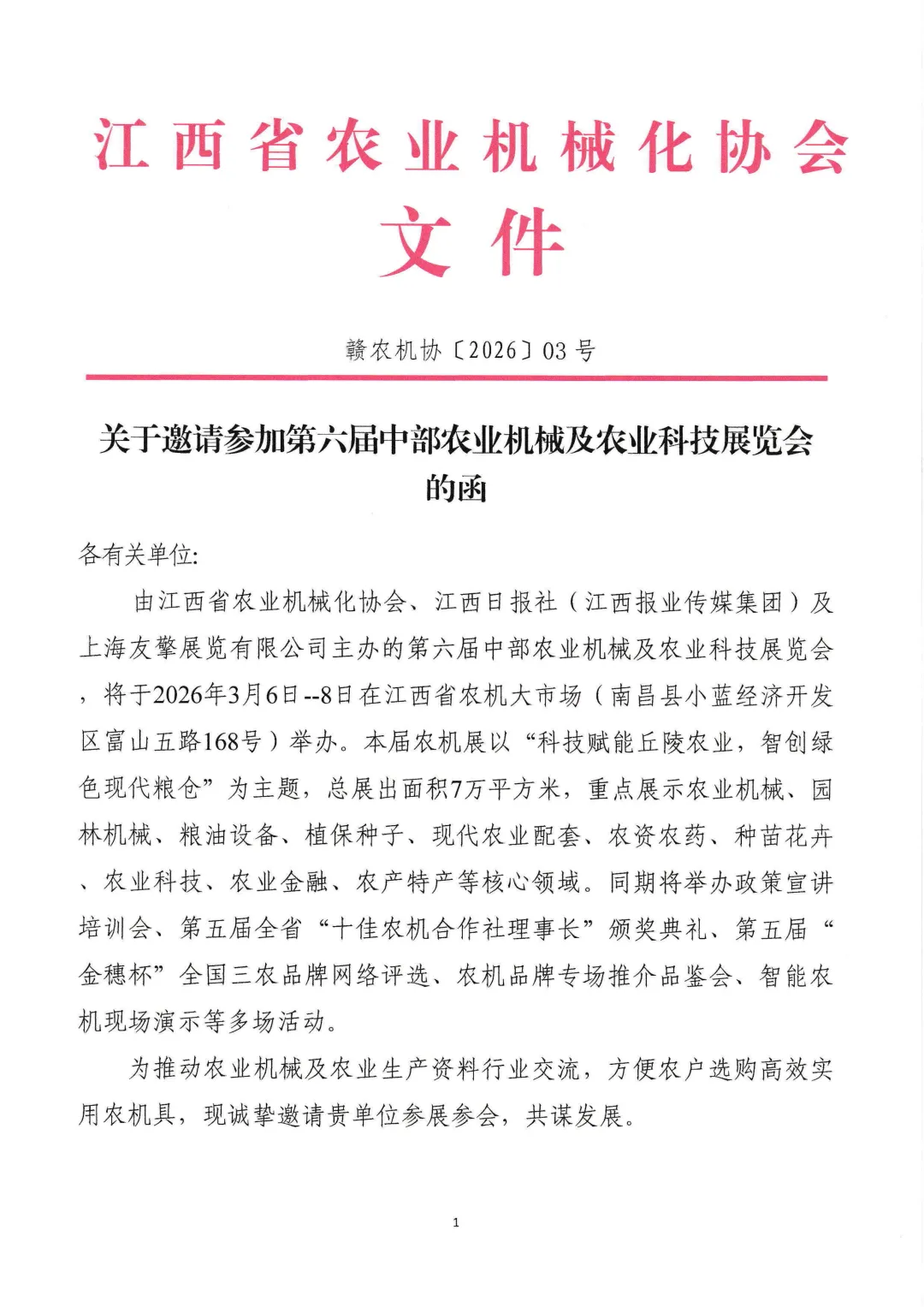 由江西省农业机械化协会、江西日报社(江西报业传媒集团)及上海友擎展览有限公司主办的第六届中部农业机械及农业科技展览会,将于2026年3月6日--8日在江西省农机大市场(南昌县小蓝经济开发区富山五路168号)举办。本届农机展以“科技赋能丘陵农业,智创绿色现代粮仓”为主题,总展出面积7万平方米,重点展示农业机械、园林机械、粮油设备、植保种子、现代农业配套、农资农药、种苗花卉、农业科技、农业金融、农产特产等核心领域。同期将举办政策宣讲培训会、第五届全省“十佳农机合作社理事长”颁奖典礼、第五届“金穗杯”全国三农品牌网络评选、农机品牌专场推介品鉴会、智能农机现场演示等多场活动。