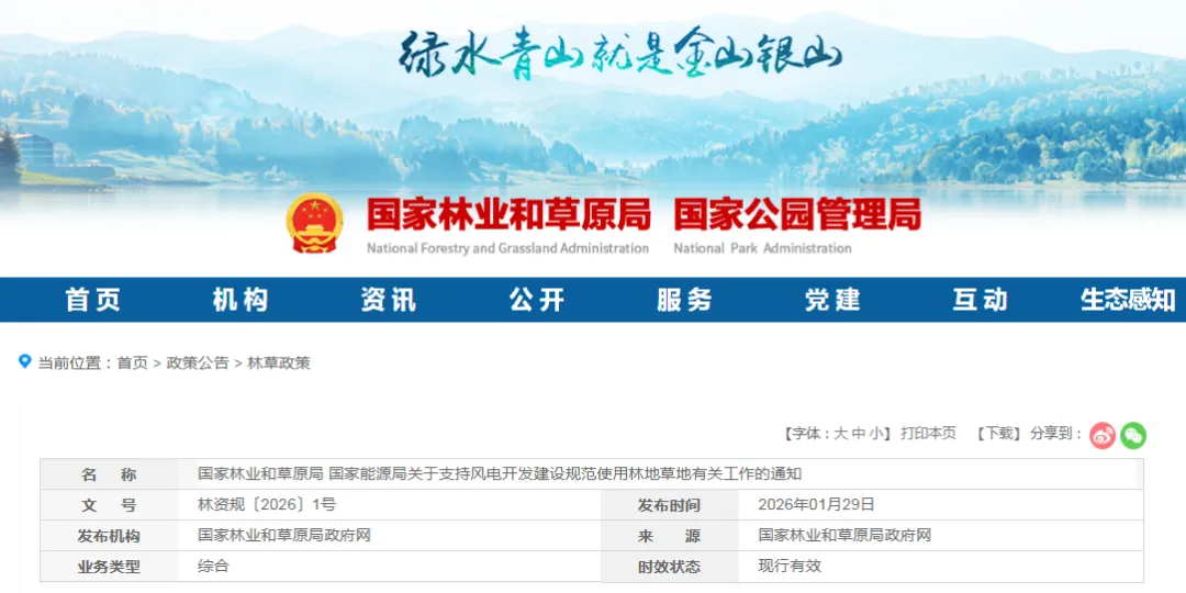 1月29日,为统筹风电开发建设与林地草地保护,推动风电场项目规范使用林地草地,促进风电高质量发展,国家林业和草原局、国家能源局联合发布《关于支持风电开发建设规范使用林地草地有关工作的通知》(以下简称《通知》)。《通知》自发布之日起施行,有效期至2030年12月31日。