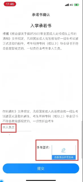 提交签署:签名确认后,系统自动保存签名信息,完成承诺书签署环节,进入下一步。