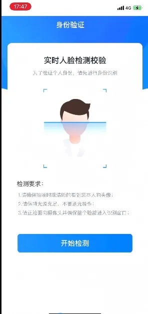 进入人脸核验界面,请按照检测要求完成核验。人脸核验旨在确认操作者为本人,需严格遵守系统指示操作,否则将导致核验失败。
