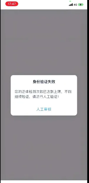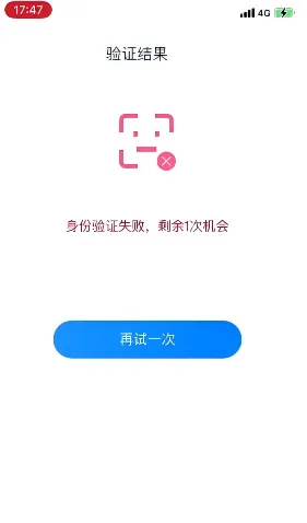 若人脸比对不通过,系统将弹出身份验证失败,此时可点击【再试一次】重新进行人脸核验;