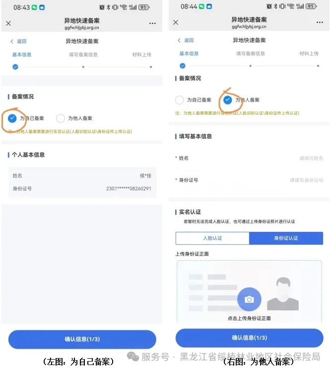 注:异地长期居住人员需要提供有效期内的居住证(正反面) 或长期居住地身份证(正反面)或长期居住地户口(首页本人页),上传其中一种认定材料即可。
