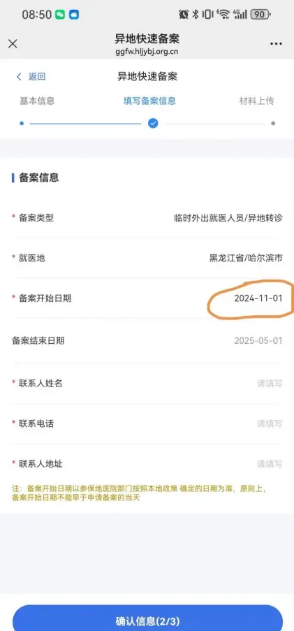 注:备案开始日期选择入院前一天。