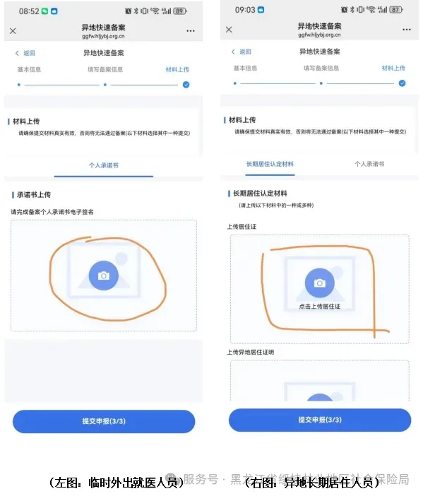 注:之前选择的“临时外出就医人员”,需要手写“签名”。之前选择的“异地长期居住人员”,需要上传“有效期内的居住证(正反面) 或长期居住地身份证(正反面)或长期居住地户口(首页本人页),上传其中一种认定材料即可。”