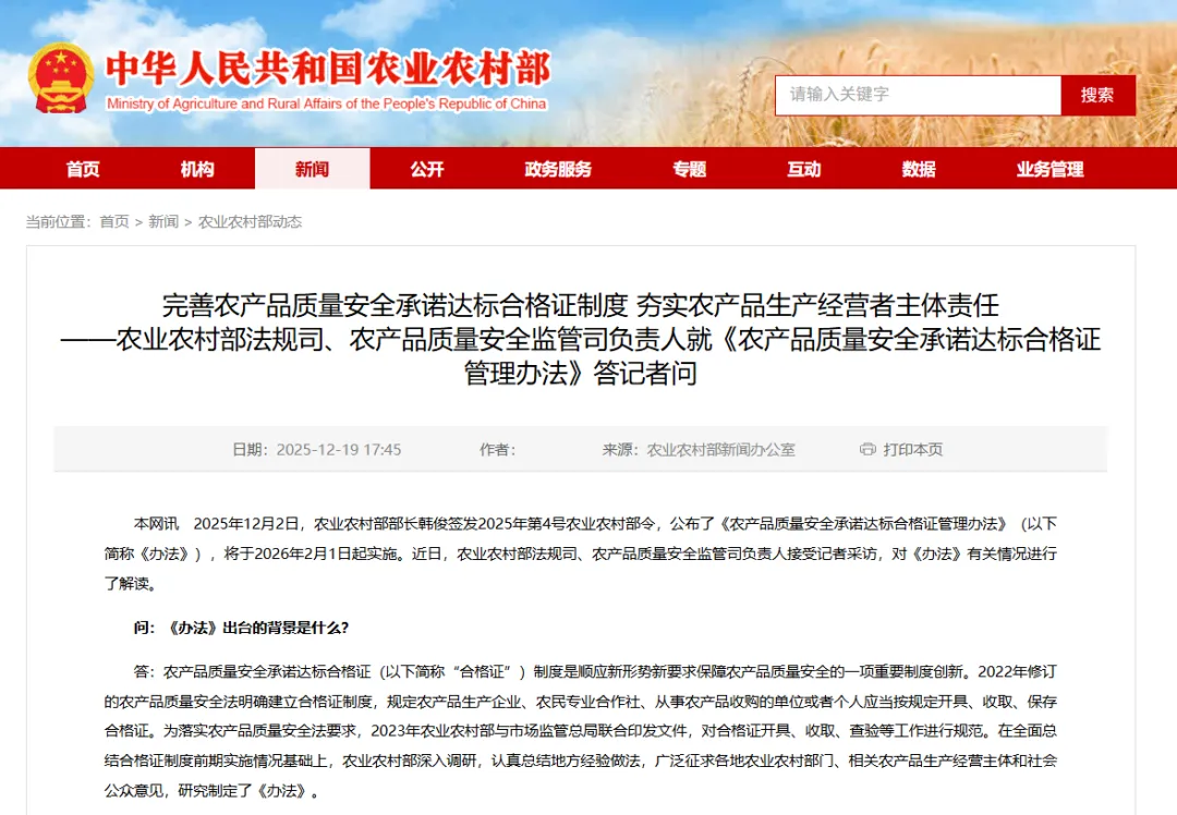 《农产品质量安全承诺达标合格证管理办法》(以下简称《办法》)将于2月1日(后天)正式施行。为进一步压实农产品生产经营者主体责任,打通产地准出与市场准入衔接通道,筑牢百姓“舌尖上的安全”防线,这一配套制度的落地意义重大。作为《中华人民共和国农产品质量安全法》的重要配套举措,《办法》将规范农产品生产经营全流程管理。近日,农业农村部法规司、农产品质量安全监管司负责人接受记者采访,对《办法》有关情况进行了解读。