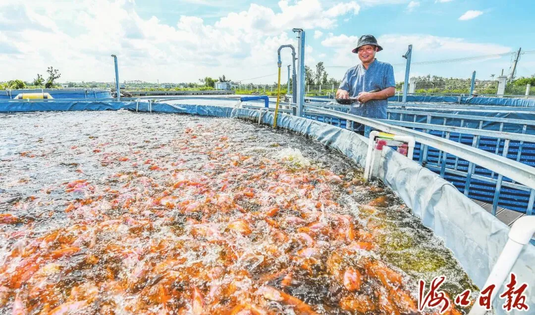 海口枷椗山现代农业工厂化养种产业基地内,工作人员为红鲷鱼喂食。海口市融媒体中心记者 康登淋 摄