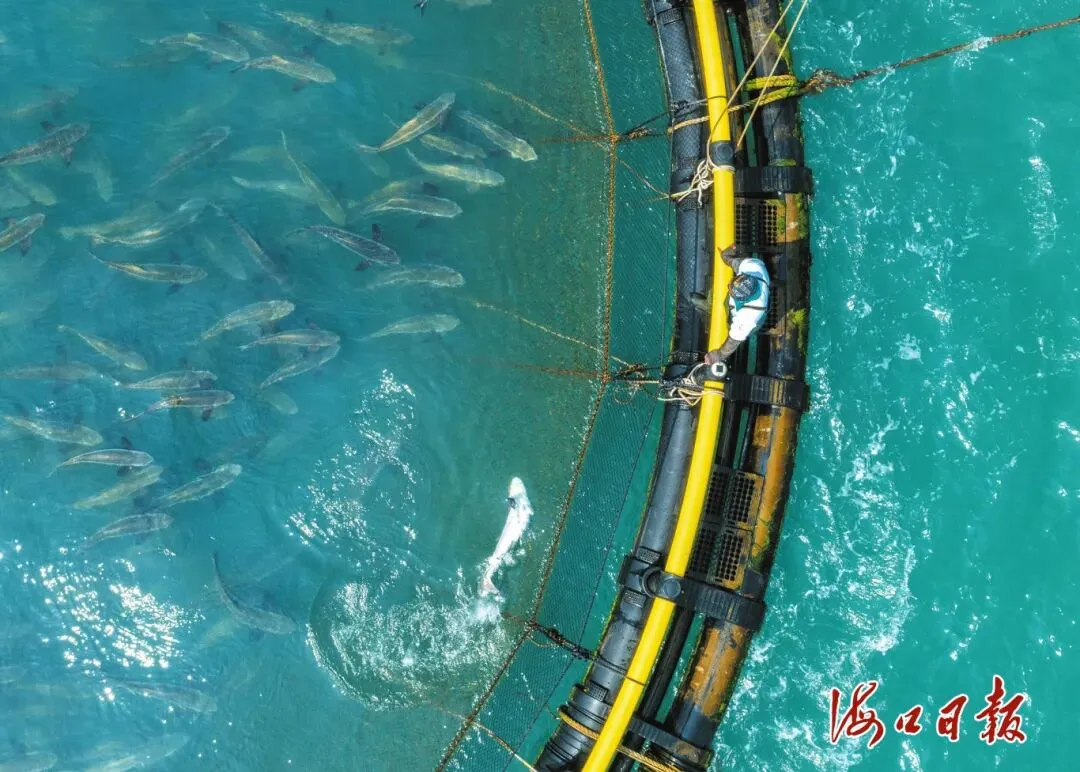 海口市秀英区荣山寮村西侧海域,蔚蓝的海面上漂浮着深水网箱,里面养殖的军曹鱼长势喜人。海口市融媒体中心记者 石中华 摄