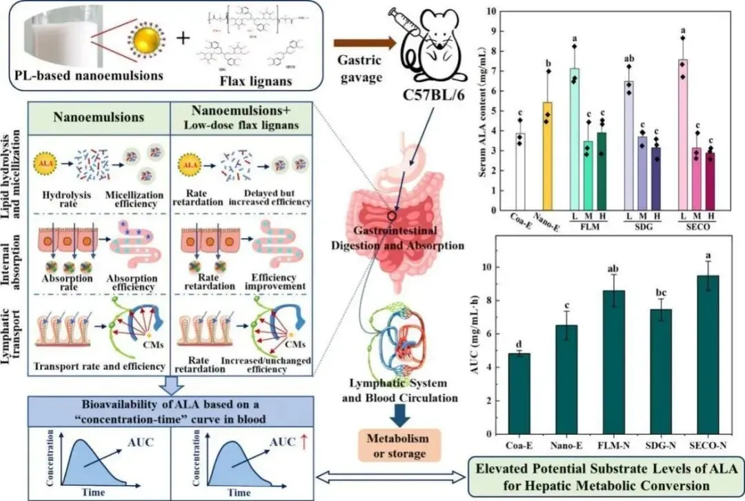为此,团队围绕亚麻籽中具有抗氧化、改善胰岛素抵抗等作用的功能成分亚麻木酚素开展系统研究,发现其作为有效的膳食调节因子,可提高肠道吸收效率,激活肝脏中的关键转化酶,与单独摄入富含α-亚麻酸的亚麻籽油乳液相比,共摄入亚麻木酚素可使小鼠血清中EPA和DHA水平分别提升31.9%和20.2%,肝脏中的EPA水平增加35.1%。同时,亚麻木酚素还能引导新合成的脂肪酸更好地通过血液循环融入细胞膜和穿越组织屏障,从而更充分地发挥健康作用。