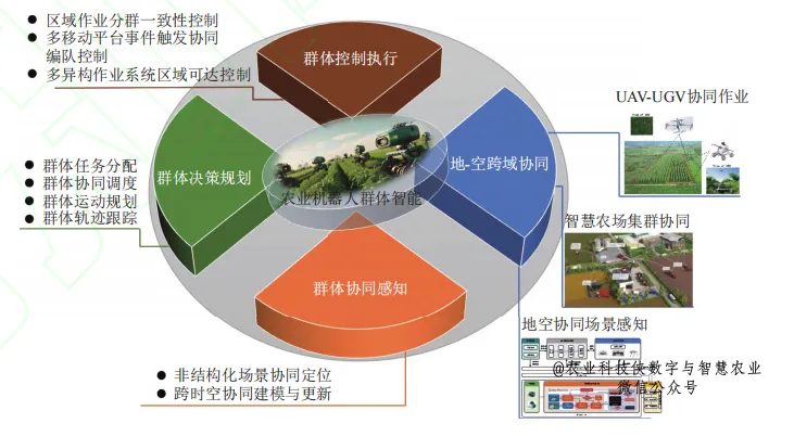 田间农业机器人主要应用于作物表型监测、农情巡检、土壤墒情检测、杂草识别与靶向除草、土地精细平整及特种作物选择性收获等任务。其核心技术体系涵盖高精度导航定位、机器视觉感知、智能决策算法、自主路径规划与运动控制,以及多模态作业执行机构的协同控制等关键环节。在田间作业中,群体智能技术已逐步应用于“耕、种、管、收”等高劳动强度环节,并展现出巨大的应用潜力。