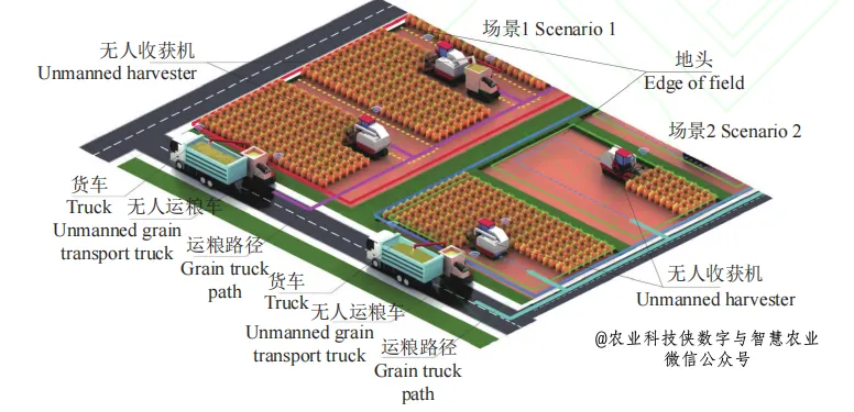 田间试验表明,该系统可在无碰撞的情况下完成协同收获,显著提升作业效率,验证了无线通信与多机协同控制在大田群体作业中的可行性与有效性。满忠贤等[117] 针对多台无人化收获机与运粮车辆的协同效率问题,构建了改进型连续时间马尔科夫链模型,对协同收获过程中的状态转移进行建模与优化,多机调度示意图如图 2。该方法以最小化非作业时间为目标,结合实时作业参数预测各收获机的卸粮时间,动态调整卸粮顺序与调度策略,实现收获—卸粮—转运全流程的自主协作。在华南地区的田间验证中,试验对象为两台不同型号的无人驾驶水稻收获机与一台运粮车,作业场景涵盖同田块协同和跨田块转运两类典型情况。结果显示,相较于传统“仓满召唤”卸粮模式,收获机 1 和收获机 2 的作业完成时间减少了 10.25% 和 17.28%,运粮车的作业完成时间减少了 10.71%,协同收获平均作业完成时间减少了 13.58%,有效缓解了等待卸粮造成的作业瓶颈。