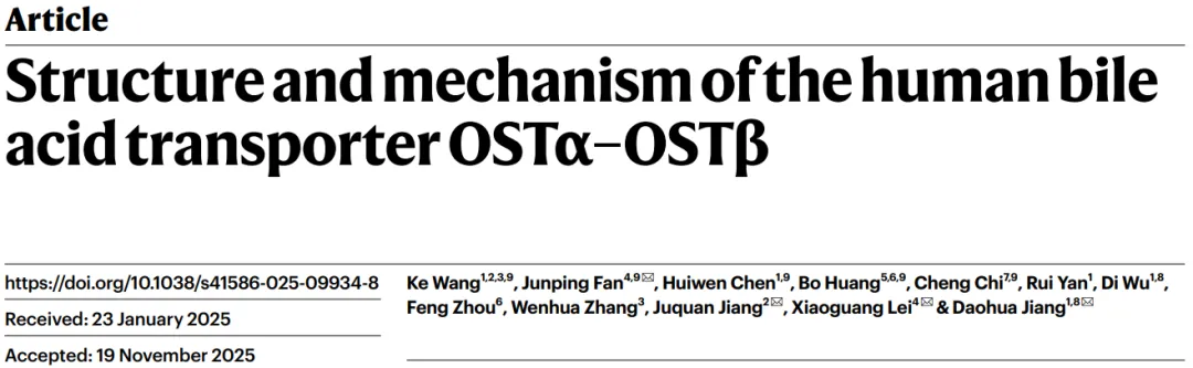 北京时间2026年1月29日,中国科学院物理研究所姜道华团队联合北京大学雷晓光团队和东北农业大学姜巨全团队等多家单位在《自然》(Nature)发表题为“Structure and mechanism of the human bile acid transporter OSTα-OSTβ”的文章,报道了OSTα/β高分辨率冷冻电镜结构,揭示该复合物新颖的组装方式和转运机制。
