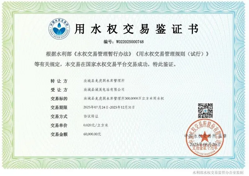 (三)水价改革,激活“节-补-管”联动式长效运行机制。一是构建协同推进机制,灌区出台《汝城县农业水价综合改革实施方案》,成立由副县长任组长的农业水价综合改革领导小组,负责统筹规划与政策制定;县发改、财政、水利、农业等部门协同联动,明确职责分工与成本核算;灌区乡镇政府负责具体组织实施与水费收缴,形成了“县级统筹、部门协同、乡镇落实”的三级责任体系。二是建立精准补贴机制,严格执行用水总量控制与年型差异化配水计划,建立与节水成效、调价幅度、财力状况相匹配的精准补贴机制。在广泛调研和成本核算的基础上,明确农业灌溉水价为0.05元/立方米,既体现水资源稀缺价值,又考虑农民承受能力。在5个乡镇的分界断面全部安装计量设施,实时监测各镇实际用水量,计量数据与考核硬挂钩,根据节水率建立优秀、良好、及格、不及格四级评价考核体系,补贴兑付比例根据考核等级分别按实缴水费110%、100%、90%、80%进行补贴,对节水成效显著的用水户给予上浮补贴,有效激发节水内生动力。三是推行工程管护分级负责制,干渠由水库管理所与乡镇共同管理,支渠及以下由属地负责,考核结果与管护资金直接挂钩,形成权责明确、激励相容的管护机制。通过国债项目实施与水价改革双轮驱动,灌区有效灌溉面积从7.64万亩恢复至8.85万亩,预计年增产粮食达530万公斤,灌区社会经济效益显著提升。 (四)水权流转,开辟“确权—回购—交易”市场化流转路径。一是实行乡镇水权确权,灌区突破传统行政主导、计划分配的粗放用水模式,创新构建以乡镇为主体的水权分配体系。以1480万立方米农业取水许可总量为基准,统筹考虑渠系利用效率、作物结构、土壤墒情与需水定额等要素,推行“以亩定水为基础、以效定水为补充”的分配模式,将用水权精准分配至5个灌区乡镇,实现“一镇一量、一镇一证”。二是推行政府回购,激活并培育水权交易市场,建立阶梯式回购机制,对灌区乡镇节余水权额度0-600万立方米部分按0.001元/立方米回购、超出600万立方米部分按0.002元/立方米回购,同时给予节水奖励和精准补贴。三是进行市场交易,作为出让方,汝城县龙虎洞水库管理所依托中国水权交易平台,将灌区的节余水量进行跨行业流转,创新性与城溪电站进行跨行水权交易,成功完成全省首例农工水权交易,年交易水量达300万立方米。结合现代化灌区建设试点,拓宽节水工程建设管护运行渠道,交易收益专项用于节水奖励与工程养护,形成“节水—交易—收益—再节水”的良性循环,有效打通水资源价值转化路径。 龙虎洞灌区取水权交易证书