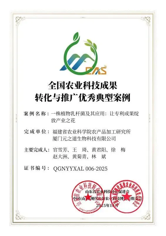 日前,通过中国(山东)高效农业科技博览会组委会专家严格评选,由福建省农业科学院农产品加工研究所和厦门元之道生物科技有限公司共同完成的科技成果“一株植物乳杆菌及其应用:让专利成果绽放产业之花”从全国众多申报项目中脱颖而出,入选2025年“全国农业科技成果转化与推广优秀典型案例”。