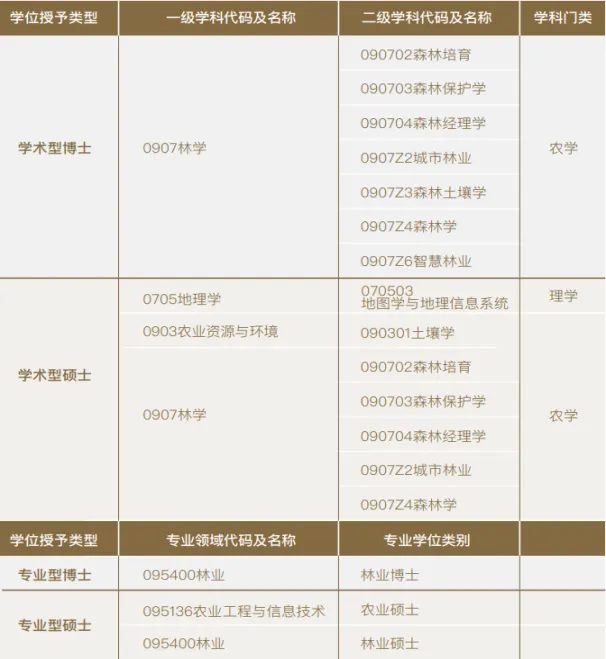 林学一级学科为国家“双一流”建设学科,包含森林培育、森林经理学、森林保护学、城市林业、森林学、森林土壤学和智慧林业等7个二级学科,森林培育、森林经理学、森林保护学为国家重点学科;土壤学为北京市重点学科;地图学和地理信息系统为国家林业与草原局重点培育学科。学院现有林学一级学科博士学位授权点,包含7个林学二级学科博士学位授权点、5个林学二级学科硕士学位授权点,设有农业资源与环境一级学科硕士学位授权点和地图学与地理信息系统硕士学位授权点;具有林业专业博士学位授权点。设有林学博士后流动站。