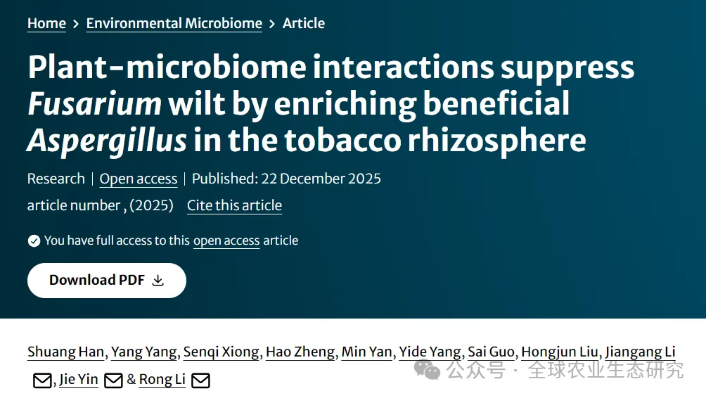 近日,Environmental Microbiome在线发表了题为Plant-microbiome interactions suppress Fusarium wilt by enriching beneficial Aspergillus in the tobacco rhizosphere的研究论文,揭示了健康烟草通过富集有益 Aspergillus 真菌,重塑根际微生物网络,从而有效抑制镰刀菌枯萎病的生态机制。南京农业大学李荣教授、四川省烟草公司宜宾市公司Jie Yin及南京土壤研究所李建刚教授为该论文共同通讯作者。