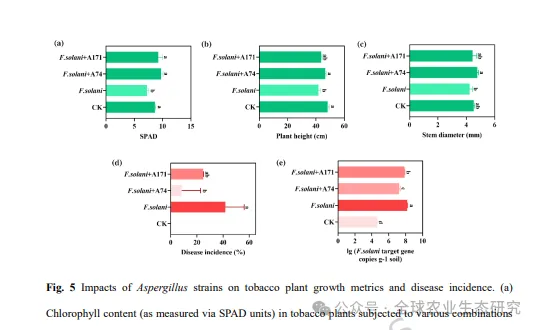 研究人员在中国四川省三个地理位置不同的烟草种植区,对健康植株与感染枯萎病植株的根际真菌群落进行了高通量测序分析。结果显示,不同地点的真菌群落组成存在明显差异,但健康烟草根际普遍富集有益真菌类群。其中,Aspergillus 属的一个操作分类单元(OTU2223)在健康土壤中高度富集,被认为是潜在的关键抑病因子。相反,发病土壤中则以病原性镰刀菌占据主导地位,尤其是 Fusarium solani(若为专化型,文中为 F. solani f. sp. nicotianae)。微生物共现网络分析进一步发现,与发病土壤相比,健康根际微生物网络具有更多节点(306 vs. 282)和更高的模块化程度(0.46 vs. 0.31),表明其结构更复杂、稳定性更强。此外,研究人员成功分离获得一株 Aspergillus 菌株A74。该菌株在体外实验和温室条件下均表现出对烟草专化型镰刀菌 (F. solani f. sp. nicotianae) 的显著拮抗作用。施用A74后,接种病原菌的烟草植株在株高、茎粗和叶绿素含量等生长指标上,与健康植株基本一致,枯萎病发生显著降低。