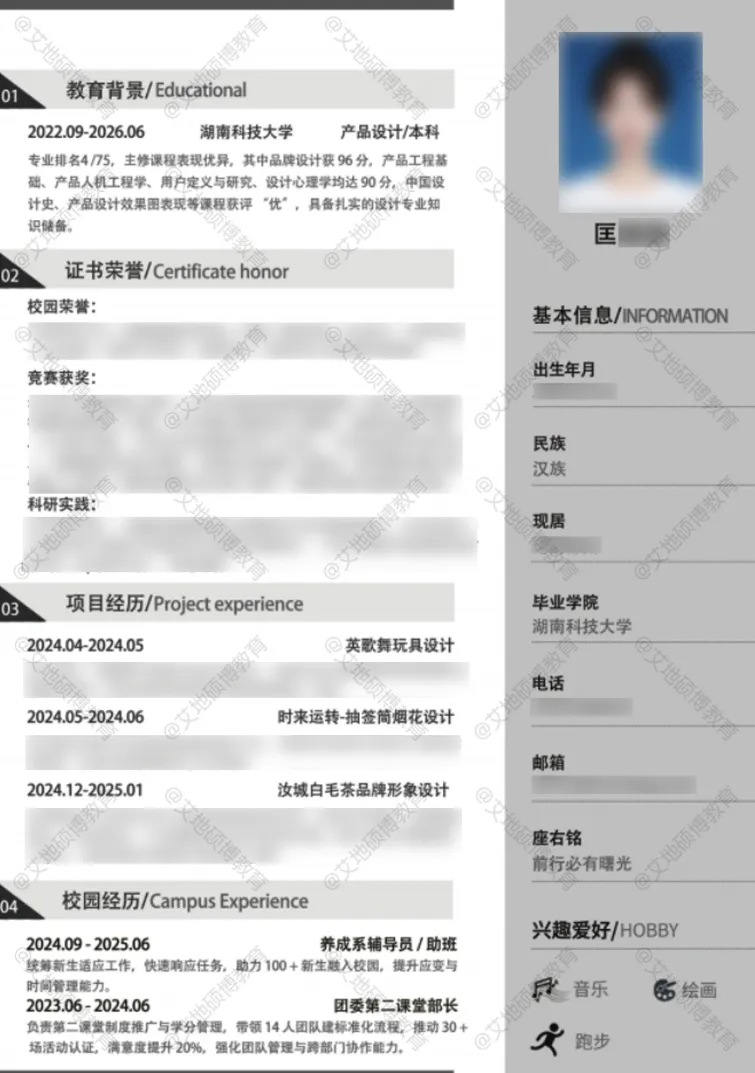 我的本科院校是湖南科技大学,在产品设计专业的学习中,我打下了扎实的基础,专业排名4/75。