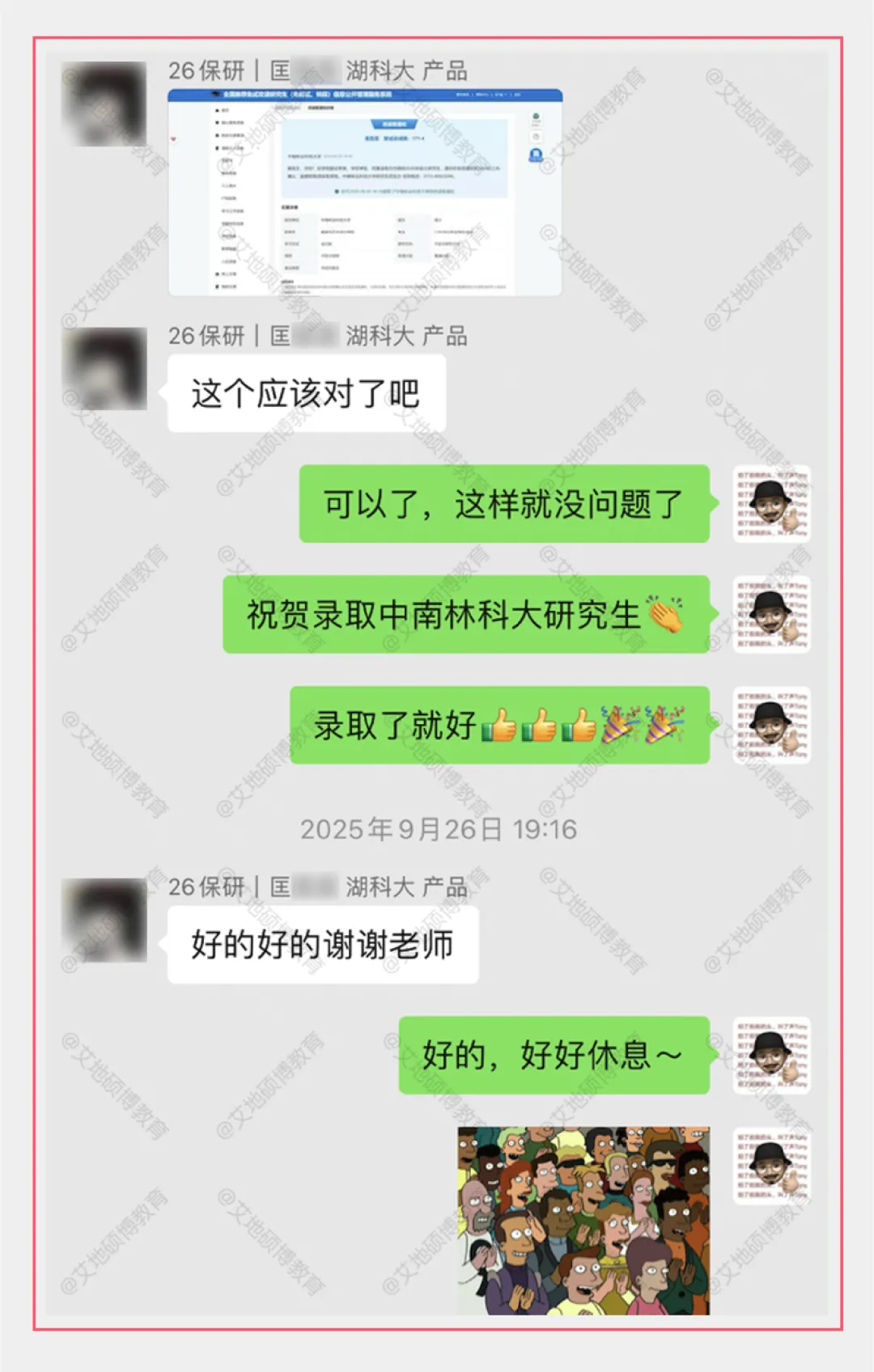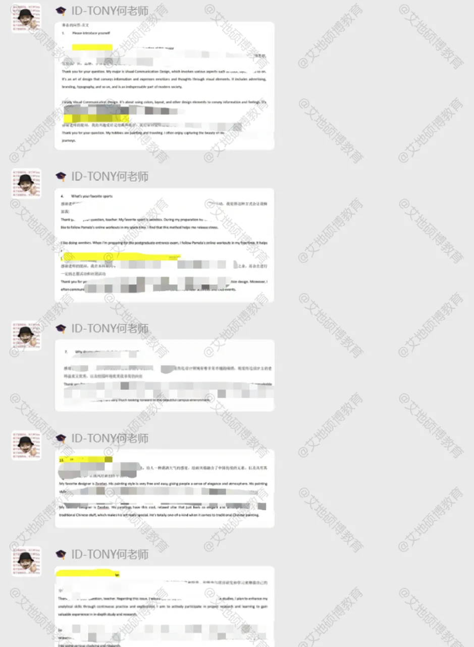 在参加复试前,艾地老师很积极地给我整理院校可能考到的中英文问题,在很大程度上提升了我备考的效率,同时,在考前老师也有针对性地辅导英语口语技巧。