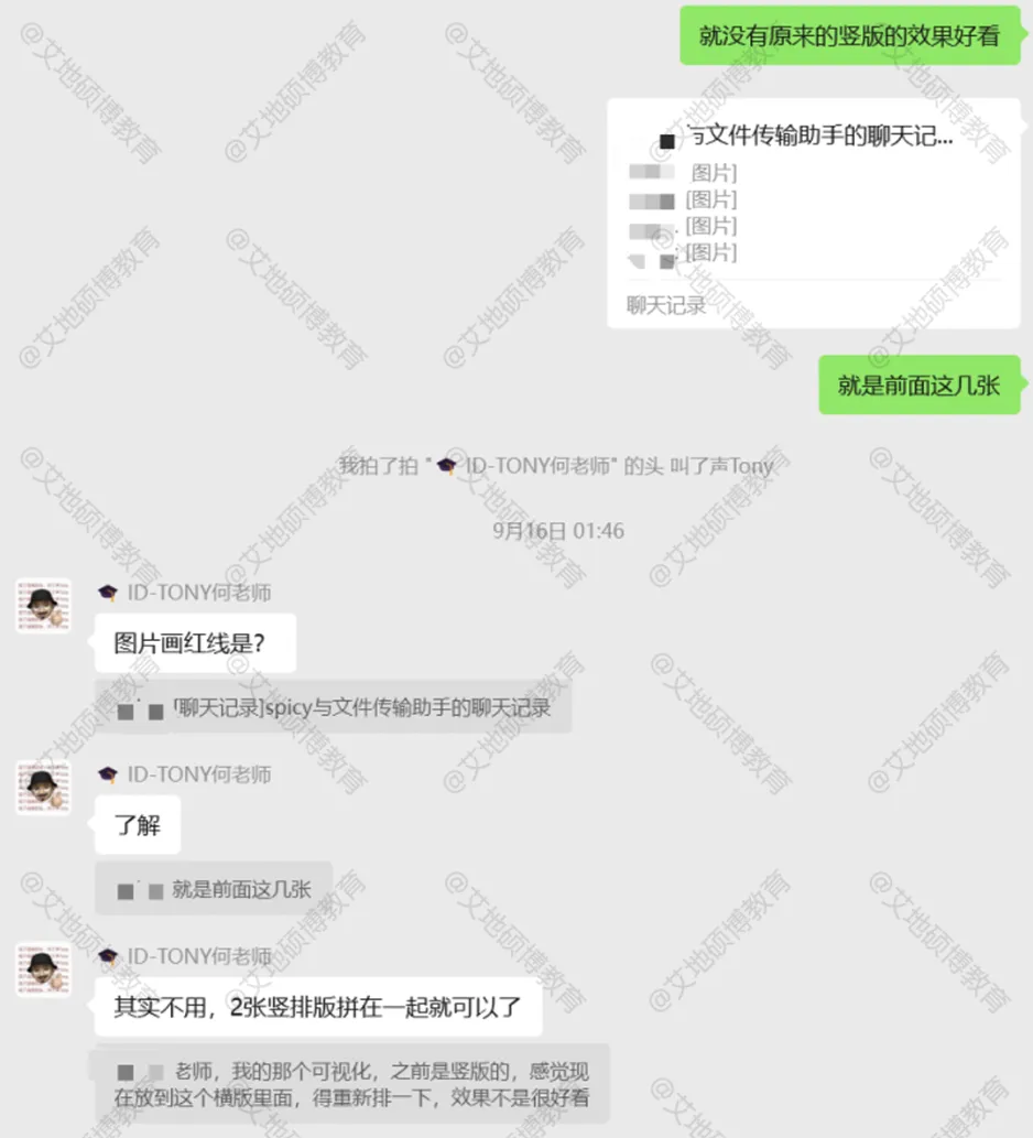 在整个作品集的准备过程中,艾地的老师非常认真负责,因为我准备的时间太紧张,老师也是最大限度地辅助我,很晚的时间也在回复我的消息。