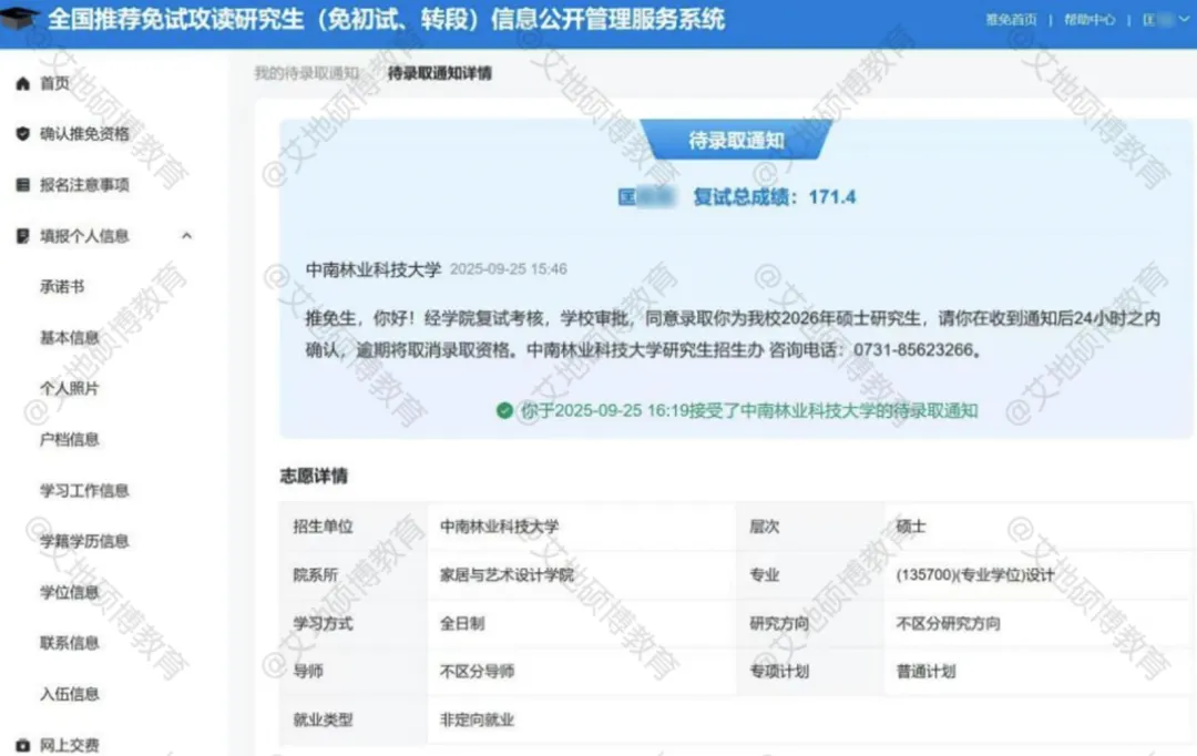 推免阶段,我重点关注了学科特色与个人兴趣高度契合的院校。中南林业科技大学拥有深厚的学术积淀和行业影响力,其研究方向和资源平台与我未来的发展规划高度匹配,因此成为我的最终选择。