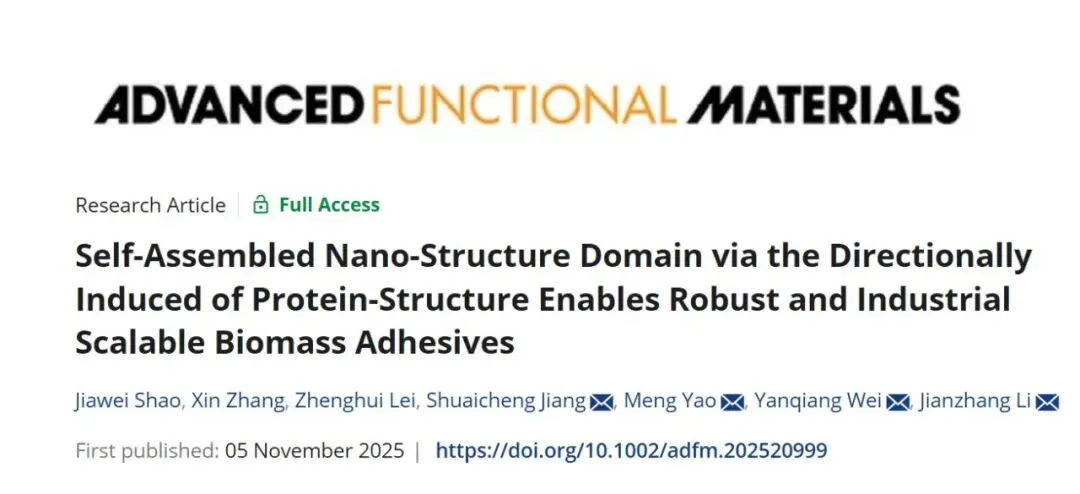 北京林业大学李建章教授《Adv. Funct. Mater.》:酶诱导自组装纳米结构域制备高强度的生物质胶粘剂!