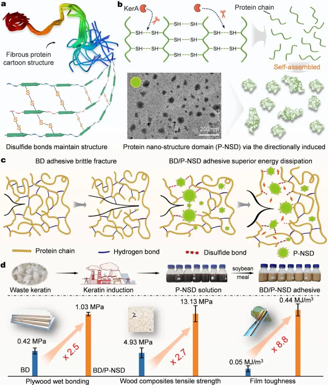 图1 生物质粘合剂由通过定向诱导蛋白自组装的纳米结构域组成。a) 维持蛋白质高级结构的二硫键示意图。b) 酶定向诱导蛋白质结构转化形成自组装纳米结构域。c)高性能生物质胶粘剂纳米结构域制备的增强机理。d) BD/P-NSD1.5(橙色列)胶粘剂的多种应用性能优于 BD(蓝色列)胶粘剂。
