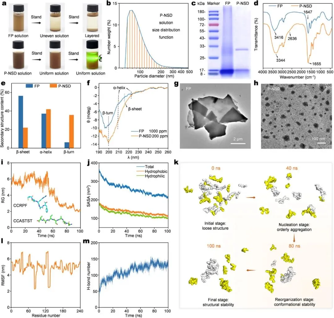 图2 通过定向诱导废羽毛蛋白生成的自组装纳米结构域的验证。a) FP 和 P-NSD 的水相容性。b)P-NSD的流体动力直径数分布函数。c) SDS-PAGE,d) FTIR 曲线,e) 二级结构含量,以及 f) FP 和 P-NSD 的 CD 光谱。g) FP 和 h) P-NSD 的 TEM 图像。i)半径回转(RG)曲线,j)溶剂可及性表面积(SASA)曲线,k)0、40、80和100 ns处的模拟结构快照,l)均方根波动(RMSF),以及m)CCRPF和CCASTST肽序列聚集组装动力学模拟的氢键数变化。
