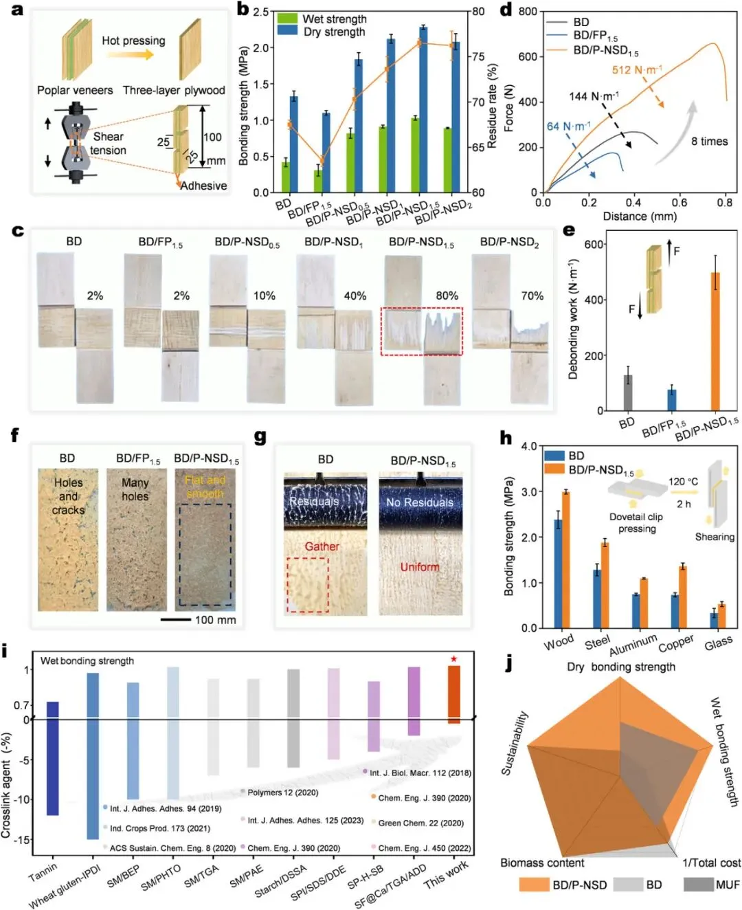 图3 纳米域增强型生物质胶粘剂的机械性能及综合评估。a) 胶合板热压示意图及用于搭接粘接测试的样品尺寸。b) 不同胶粘剂的干态、湿态粘接强度及残留率(图基检验,n = 6,p < 0.05,平均值 ± 标准差)。c) 搭接胶合界面损伤图像。d) 湿态粘接强度的力-距离曲线。e) 湿态粘接强度测试中获得的粘接脱开功(图基检验,n = 6,p < 0.05,平均值 ± 标准差)。f) 固化胶粘剂层的图像。g) 不同胶粘剂的涂层性能。h) BD/P-NSD1.5 胶粘剂对不同基材的重叠粘接强度(图基检验,n = 3,p < 0.05,平均值 ± 标准差)。i) 胶合板湿态粘接强度与 BD/P-NSD1.5 及其他生物基胶粘剂中不同交联剂添加量的比较。j) BD/P-NSD1.5 胶粘剂与 BD 胶粘剂及市售 MUF 胶粘剂的干态和湿态粘接强度、环境影响及成本的比较。