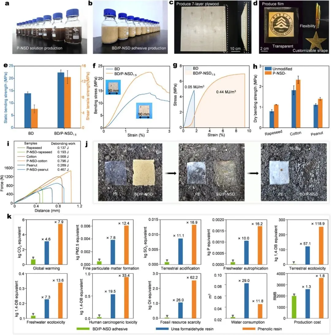 图5 通过自组装领域策略来扩大生物质胶粘剂的应用范围和可持续性。扩大以下产品的生产:a) P-NSD 溶液,b) BD/P-NSD 胶粘剂,c) 七层胶合板,以及 d) 薄膜。e) 制备用 BD 和 BD/P-NSD1.5 胶粘剂制成的木质复合材料的静态弯曲强度(图基法,n = 3,p < 0.05,平均值 ± 标准偏差)、剪切拉伸强度(图基法,n = 3,p < 0.05,平均值 ± 标准偏差)和 f) 弯曲应力(图基法,n = 3,p < 0.05,平均值 ± 标准偏差)。g) 用 BD 和 BD/P-NSD1.5 胶粘剂制备的薄膜的拉伸应力 - 应变曲线。h) 用 P-NSD 增强的菜籽粕、棉籽粕和花生粕胶粘剂的干粘结强度和 i) 力 - 距离曲线。j) BD/P-NSD 胶粘剂样品和 PE 塑料在自然土壤环境中的降解情况(尺寸:200 × 180 × 0.2 毫米)。k) 与尿素 - 甲醛树脂和酚醛树脂相比,BD/P-NSD 胶粘剂在环境影响方面的比较分析。二氯苯(1,4-DB),一种众所周知的杀虫剂,被用作该影响类别中其他参与物质毒性正常化的参考物质。