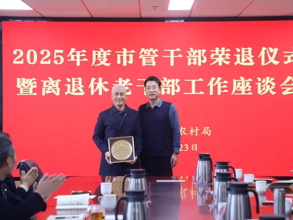 市管干部荣退仪式在温馨庄重的气氛中进行。周绪龙首先代表局党组向光荣退休的宋光荣、郑成云两位同志致以崇高的敬意和诚挚的祝福,高度评价了两位同志为全市农业农村事业发展作出的积极贡献,并向他们颁发纪念牌。两位退休干部与领导班子成员亲切交谈,分享了各自的工作历程与退休感想,表达了对农业农村事业的深厚感情与美好祝愿。