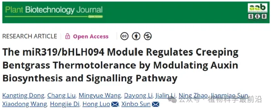 近日河北农业大学农学院孙鑫博副教授团队在植物科学领域TOP期刊《Plant Biotechnology Journal》(生物学1区TOP,IF=10.5)杂志在线发表了题为“The miR319/bHLH094 module regulates creeping bentgrass thermotolerance by modulating auxin biosynthesis and signaling pathway”的研究论文。该研究系统揭示了microRNA miR319 通过调控转录因子 bHLH094 及生长素生物合成与信号通路,精细调控匍匐翦股颖耐高温能力的分子机制,为冷季型草坪草耐热改良提供了新的理论基础和潜在靶点。