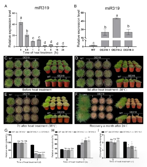 已有研究表明,miR319 在多种植物中参与生长发育及非生物胁迫响应调控,并在匍匐翦股颖中可增强耐旱和耐盐性。然而,其在耐高温过程中的作用尚未明确。本研究发现,在高温处理条件下,匍匐翦股颖体内 miR319 的表达水平迅速下降,而过量表达 miR319 的转基因植株则表现出明显的耐热性降低,包括叶片失水加剧、细胞膜稳定性下降和叶绿素含量显著降低(图1)。