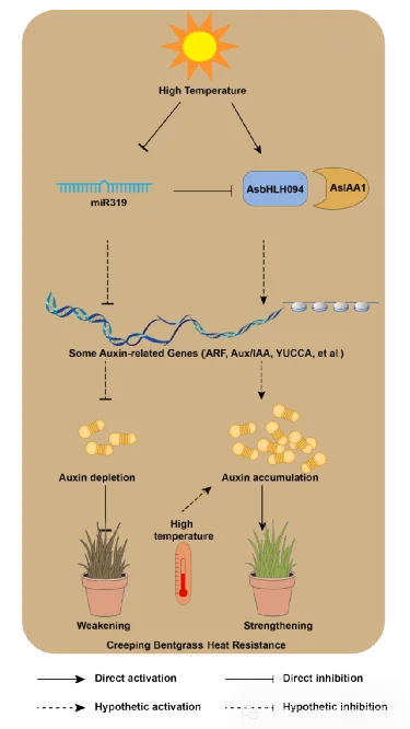 该研究提出了一个新的调控模型:在高温条件下,miR319 的下调解除其对 AsbHLH094 的抑制,AsbHLH094 通过调控生长素生物合成与信号转导增强植株耐热性。这一 miR319–bHLH094–生长素调控模块的发现,不仅加深了人们对草坪草耐热分子机制的理解,也为利用 microRNA 和激素通路改良作物和草坪草抗逆性提供了新的思路。