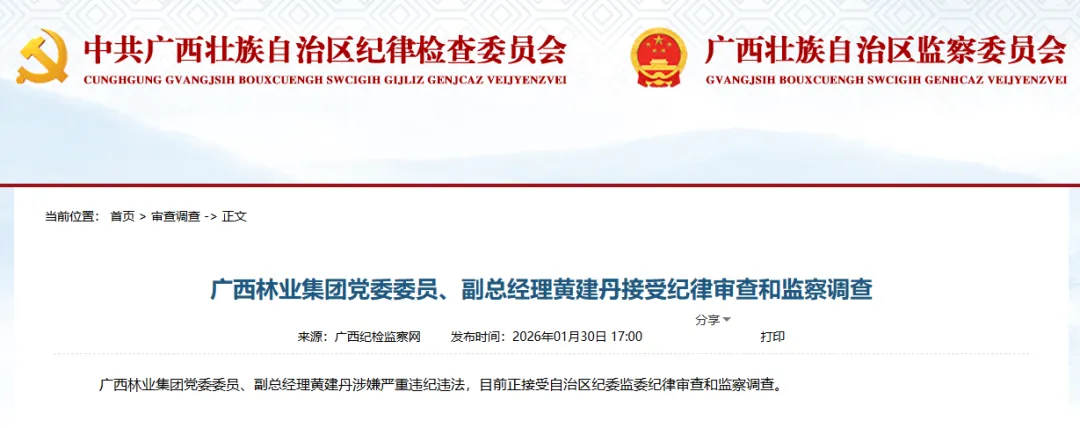 广西林业集团党委委员、副总经理黄建丹涉嫌严重违纪违法,目前正接受自治区纪委监委纪律审查和监察调查。