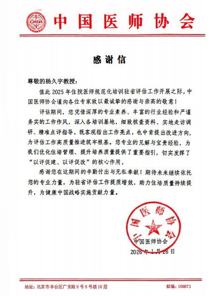 中国医师协会的感谢信,既是对杨久宇个人专业能力与奉献精神的高度认可,也是对我院住培工作整体成效的充分肯定。医院将以这份认可为动力,进一步发挥专家的引领作用,持续优化住培课程设计、加强师资培训、完善评估与反馈机制,全面提升医学人才培养质量,为推动住院医师规范化培训高质量发展、助力“健康中国”战略实施作出更大贡献。