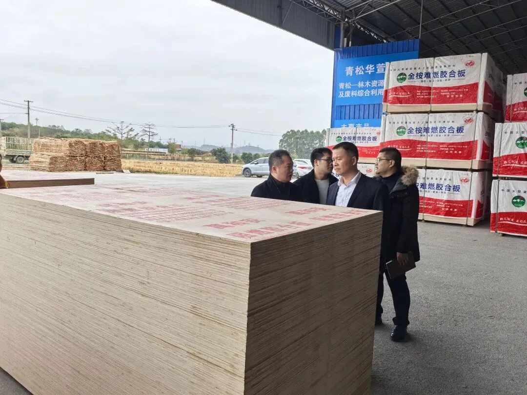 随后,在公司董事长黄盛广的陪同下,黄同屋部长一行深入公司生产一线,实地考察了胶合板生产车间和单板工业烘干生产车间。董事长黄盛广向黄同屋部长一行详细介绍了多层胶合板(阻燃板)的生产工艺、产能规模、市场销售和解决当地就业情况、国家级高新技术企业申请认证工作进展以及新建烘干生产线的建设进展和产能规模及节约用地效能,同时就青松林业的未来发展规划和当前遇到的发展挑战作了汇报。