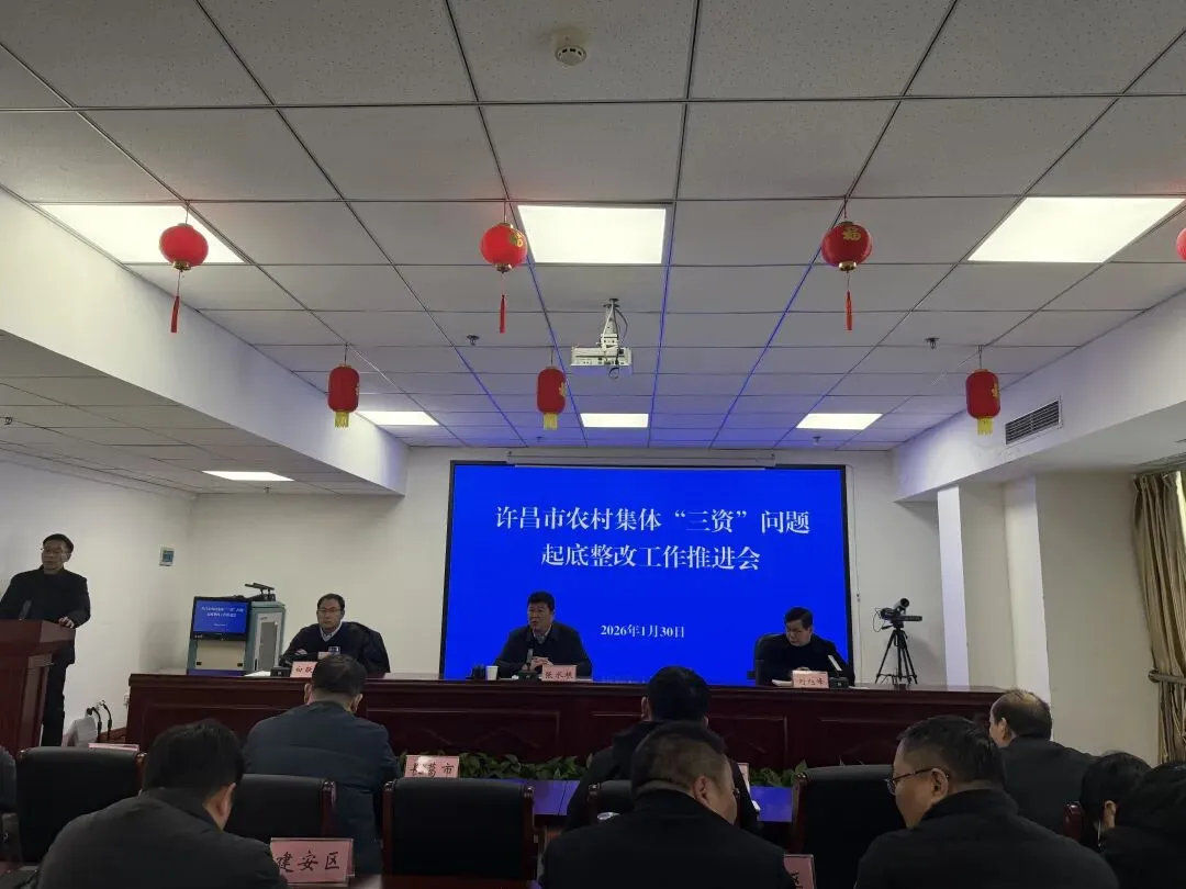 2026年1月30日下午,许昌市农业农村局召开全市农村集体“三资”问题起底整改工作推进会。市农业农村局副局长刘旭峰主持会议,局长张水根、市纪委监委驻市农业农村局纪检监察组组长白跃伟出席并讲话,各县(市、区)农业农村局主要及分管负责同志、技术公司及代账公司负责人等参加会议。会议听取各县(市、区)及技术公司工作情况,通报近期工作进展,部署冲刺阶段任务。