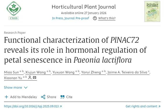 近日,Horticultural Plant Journal在线发表了北京林业大学园林学院于晓南课题组题为“Functional characterization of PlNAC72 reveals its role in hormonal regulation of petal senescence in Paeonia lactiflora(PlNAC72介导激素信号网络调控芍药花瓣衰老)”的研究论文。