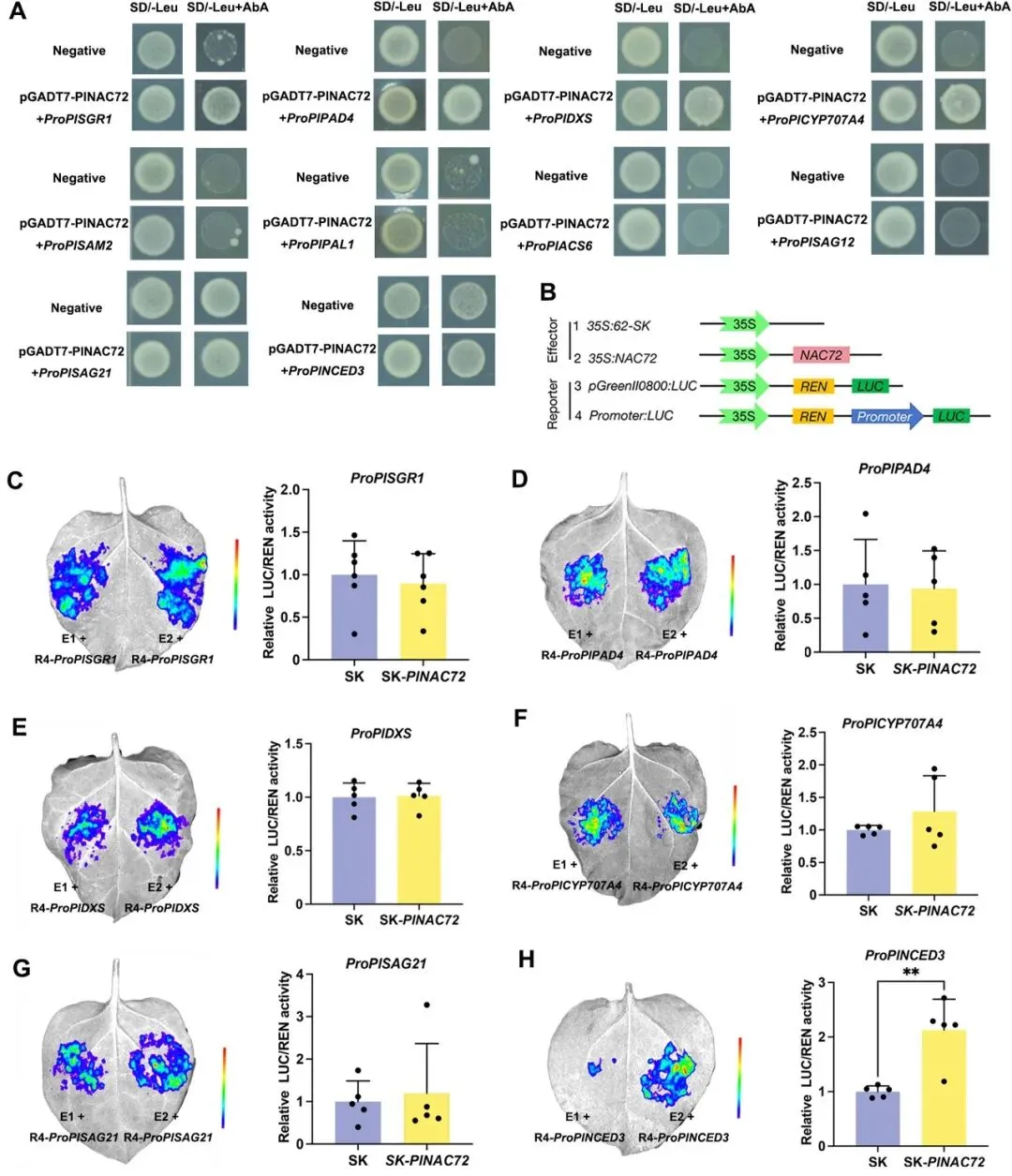 (3)PlNAC72通过与PlSGR1、PlPAD4、PlDXS、PlCYP707A3和PlNCED3基因的启动子发生互作,直接调控ABA、SA和JA-Ile的合成,从而加速芍药花瓣衰老。