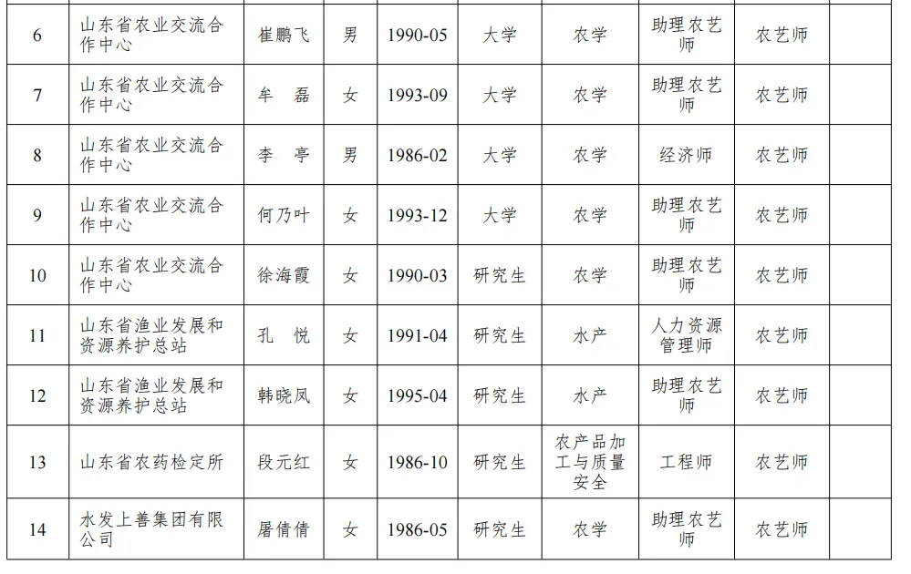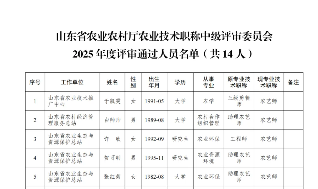 附件:山东省农业农村厅农业技术职称中级评审委员会2025年度评审通过人员名单(共14人)
