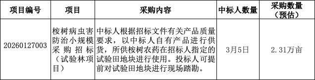 本招标项目2026年度广西丰林林业有限公司桉树病虫害防治小规模采购(试验林项目)招标,招标人为广西丰林木业集团股份有限公司,招标项目资金由招标人自筹,资金已落实,出资比例为100%。项目已具备招标条件,现以公开招标方式,面向有意向的潜在投标人(以下简称投标人)进行招标。请投标人2026年3月6日10时00分(北京时间)前递交响应文件。