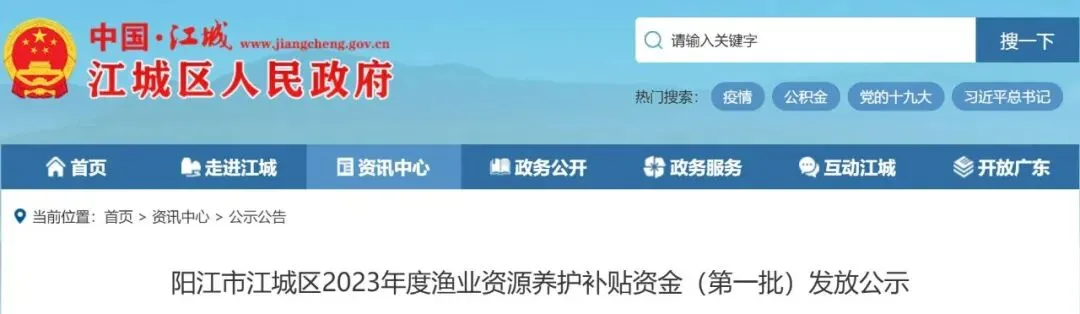 根据《农业农村部办公厅财政部办公厅关于实施海洋渔业资源养护补贴政策的通知》(农办计财[2021]44号)和广东省农业农村厅,广东省财政厅《关于印发〈广东省海洋渔业资源养护补贴政策实施方案〉的通知》(粤农农规[2022]4号)要求,现将阳江市江城区2023年度渔业资源养护补贴资金(第一批)予以公示。