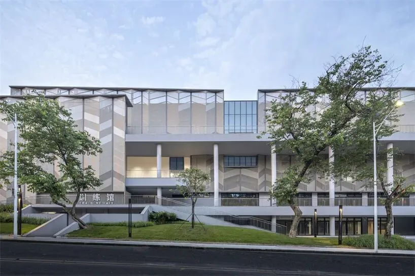 华南农业大学体育馆是华南地区首个采用开放式社区设计的高校体育馆,重新定义了体育建筑的表达方式。它摒弃了传统的封闭式建筑形式,整合了共享社区服务和混合功能,并创造了充满活力的户外空间——包括树冠广场、滑板场、步行街和多层平台——使其成为校园和社区活动的活力中心。华南理工大学建筑设计研究院的设计方案以日常可用性为优先,强化了体育馆与校园生活的融合,营造了一个充满活力的多功能空间,为校园景观增添新的社会记忆。这座三层综合体高23.7米,建筑面积52,450平方米,内设主比赛馆、训练设施和游泳馆。体育馆位于华南农业大学主入口东侧,方便外部社区通行,同时也是校园东西轴线的枢纽。场地长440米,垂直坡度13米,连接着西侧教学区和东侧生活区。体育馆位于人流密集的通勤路线沿线,既是社交催化剂,也是校园区域之间的过渡空间。其后退的体量和低调的立面与现有的成熟树木相协调,确保与周围景观无缝融合。