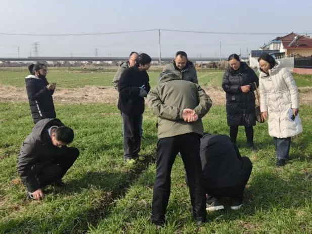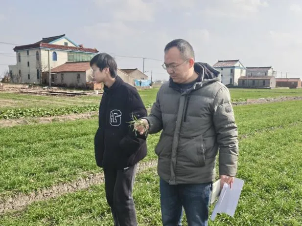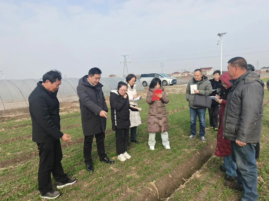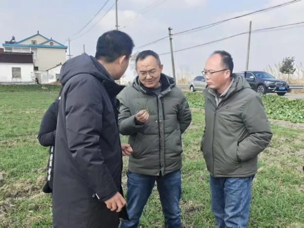 为扎实推进农业科技下沉,助力冬季田间管理和粮食稳产增产,1月29日上午,市农业农村局组建农技推广服务团队,在我镇开展田间技术指导服务。本次技术指导服务由江苏沿海地区农业科学研究所作物遗传育种与绿色高产高效示范推广沈会权研究员团队和盐城师范学院稻麦优质高产高效栽培技术研究与推广栾海业教授团队以及市农业农村局种子、植保条线的专家进行踏田指导,为我镇小麦高产优质把脉问诊传经送宝。