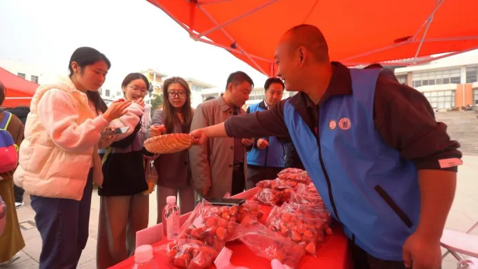(“青农大集”上师生品尝“头雁”学员的特色农产品)